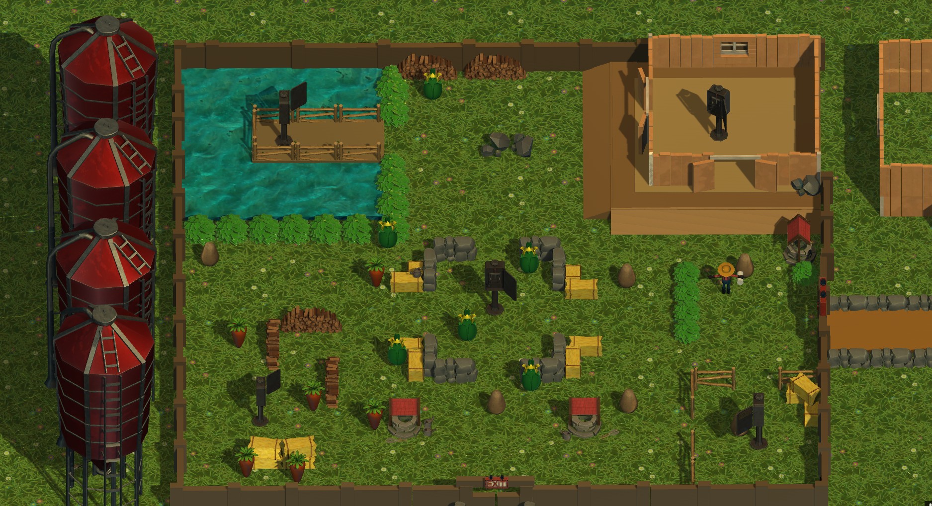 Another problem that I faced as a designer revolved around the farmers tools being limited resources. I wanted to find a way to manage the amount of crops that the farmer could harvest. In playtesting, I noticed that without restriction, the farmer would just run around harvesting anyone that got in his path. When I broke the system down originally, I considered this possibility and decided that the best way to manage that would be by limiting the amount of harvests the farmer had. This sprint, I set up the harvesting limit and got it working. Immediately, the change forced farmer players to be much more decisive and put some thought into which crops they truly thought were human players. The problem arose when the farmer would run out of harvests. If the farmers tool is out of uses, how can he continue playing effectively? This created a hole that needed to be filled. If the farmer made enough wrong decisions, he would be forced to watch the player crops finish the touchpoints and escape successfully, and there would be nothing he could do about it. To solve this problem, I came up with a repair system that allows the farmer the opportunity to repair his tool and start harvesting again. I didn't want the farmer to be able to just repair whenever and wherever, though, because this would remove the purpose of limiting the harvester in the first place. To get around this, I decided that the farmer player would need to collect scrap, just like the crops, and they could then bring that scrap to a workbench to repair their tools. This solution made it so that the farmer could still continue to play and have a chance to win, even after using all his harvests, but at the cost of time. Time is a valuable resource in this game because the more time the farmer wastes, the more time the crops have to activate the touchpoints and get closer to escape. Now the farmer needs to make a choice, harvest recklessly until he needs to spend the time to repair his tools, or be selective in which crops he harvests so that he only uses the tool on player crops and does not need to harvest. This solution also created the opportunity for different playstyles to emerge. The full speed farmer that is trying his best to stop anyone in his way, and the precise and cautious farmer who takes his time in deciding which crops seem real.