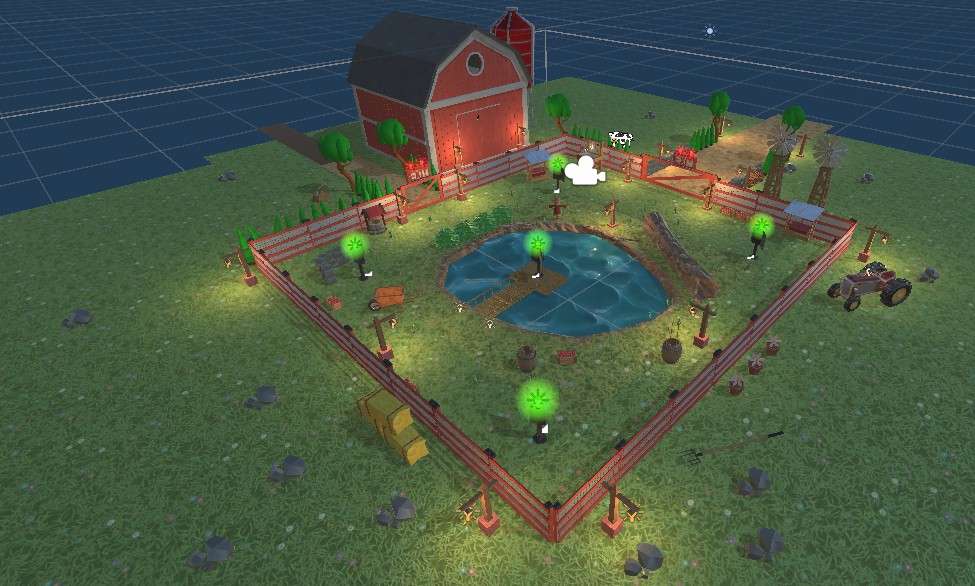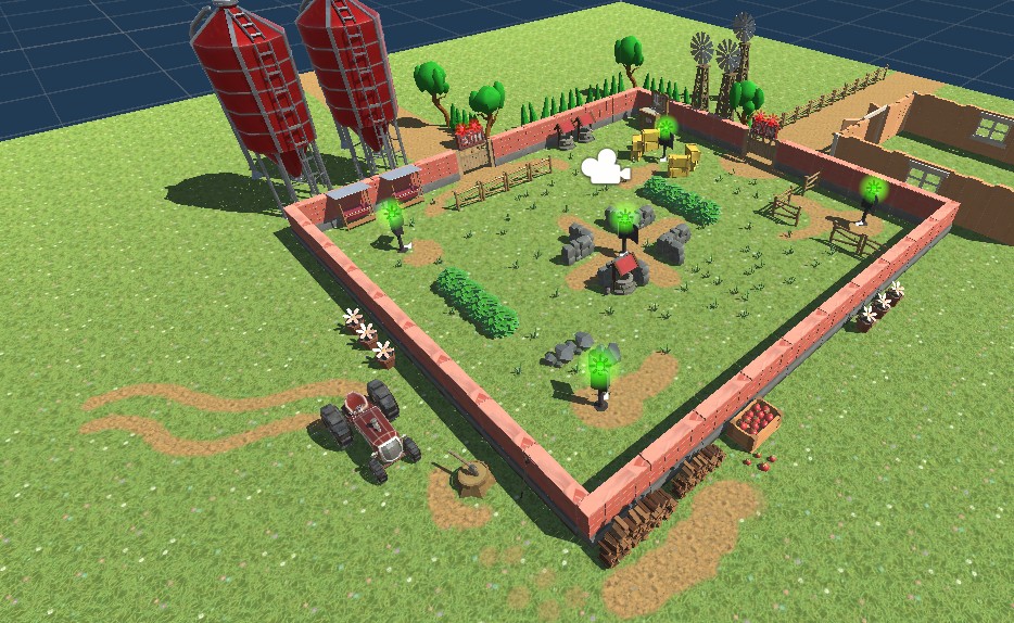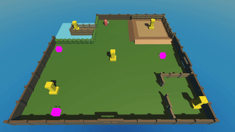 Seeing the game evolve and the design adapt and mold to what the players enjoyed has been quite a treat. The changes our levels have gone through, the way the game looks, and the way that players approach playing the levels have changed so much throughout development and it has been so interesting to see how the game has progressed. Starting from simple boxes, we managed to create something quite intriguing and playful. I got to build out both of the levels for the game, which was a very interesting process. It was made easy by the fantastic work done by our 3D modelers, but I needed to be careful about the level design to focus on gameplay balancing and making sure that everyone playing has a chance for success. I started with less obstacles in the scene, and then I found that players enjoyed using obstacles to try to create distance from them and the farmer when a chase broke out. It was so intriguing to see the instant changes in gameplay styles with such simple changes to the layout of the map. Because of this, the maps underwent iteration after iteration. They evolved from simple blockouts into fully populated levels with careful prop placement that kept player experience and balance as the top priority.
