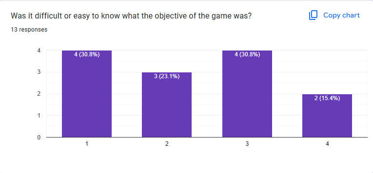 Now comes the big one. 50% of the players found it difficult to find what the objective was for the game. Which was to collect candy and eliminate other players. This is a large number that needs to be worked on. Based on this feedback, it is clear that additional time needs to be spent on this and is already in the works to be improved upon. The improvement will be a tutorial and a signal when the killer cat is transforming. This means that the game has changed and the way the players need to play is going to change as well.