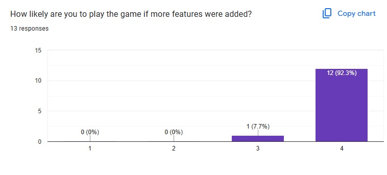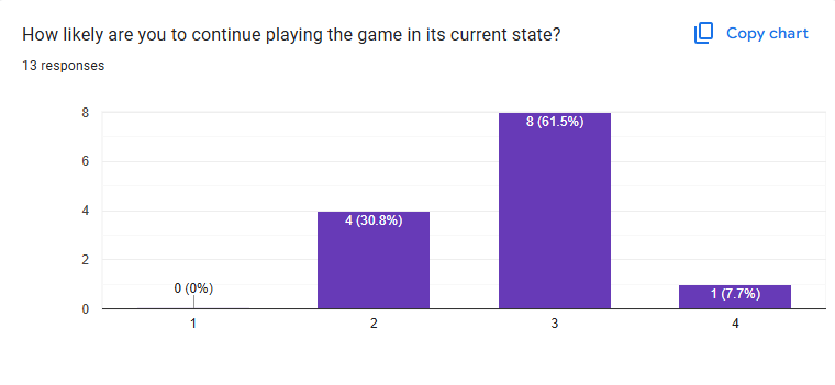 On a positive note, 100% of players answered that should more be added to the game they would play again. This question is a bit helpful although I feel can be kind of tricky since I think a lot of people for any game would answer in much the same way our players did.