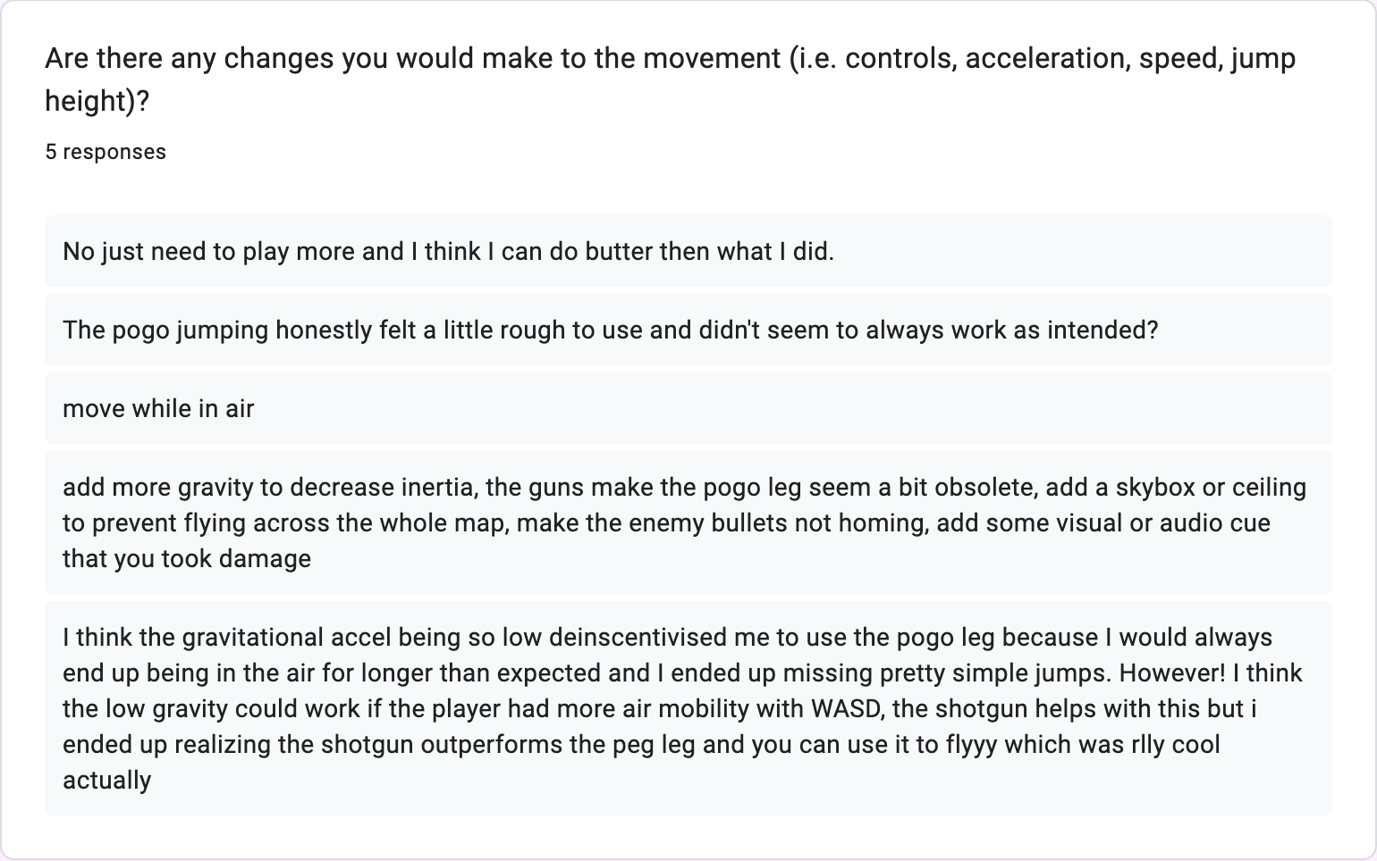 The main thing to note from the playtests is that the movement was kinda wack. For starters, players kept getting stuck on ledges. This was mainly due to using a rigidbody as the player controller and having the movement tied to Update(). This caused a lot of collision issues and meant we needed to re-evaluate our movement code. An easy fix would be switching to a player controller component instead of using a rigidbody, as the player controller component will help deal with these issues. It would also allow the player to walk up slopes, something that wasn’t possible with a rigidbody without creating our own fix in Unity. The second big thing we learned is that we need to tweak a lot of values on the player movement. A few examples include increasing gravity for the player, increasing the base jump height, increasing the amount of midair control from pogoing, decreasing gun knockback, and more. These are all things we’ll continue to adjust until we find something that feels right.