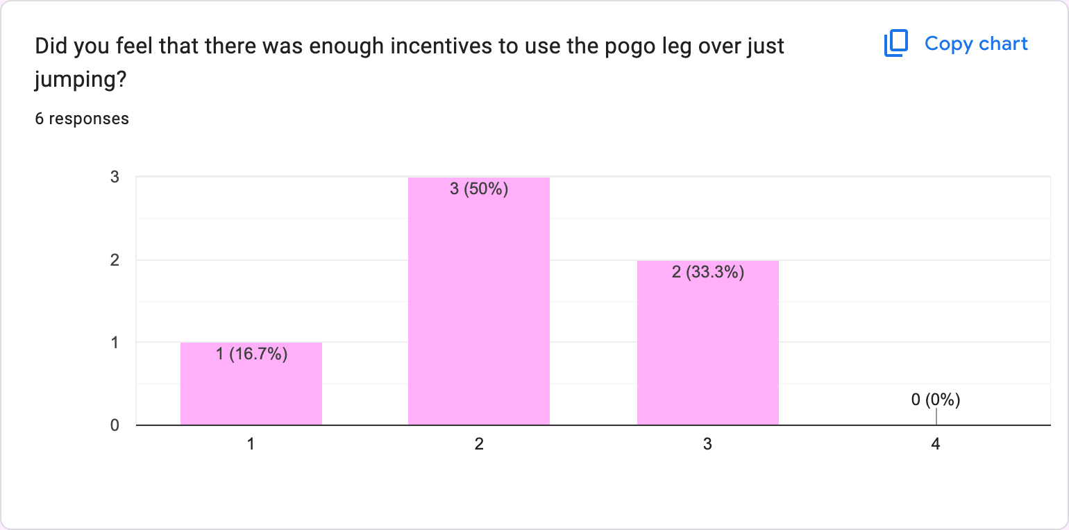 Another major thing we need to address is the balance between the gun leg and the pogo leg. What I noticed is that a lot of players preferred using the gun leg over the pogo leg, mainly because they could shoot while standing on the ground. This wasn’t the original vision for the gun, as the player should only be able to shoot while in the air. This was an oversight on my part, but it also highlighted another issue with the interplay between the pogo and gun legs. If the player can only shoot and pogo while in the air, then why would the player ever pogo if they can just immediately pogo once they leave the ground? If we nerf the gun’s knockback to push players toward pogoing, then what’s the point of shooting besides killing enemies? And if killing enemies is not the main goal of the game, then the incentives for using these movement abilities start to fall apart. One possible fix could be making the gun only able to fire after pogoing, though this will need some testing first. It’s going to take some fine-tuning to ensure that these systems work together and each carve out their own niche in the movement sandbox. Otherwise, the game could quickly become very one-note.