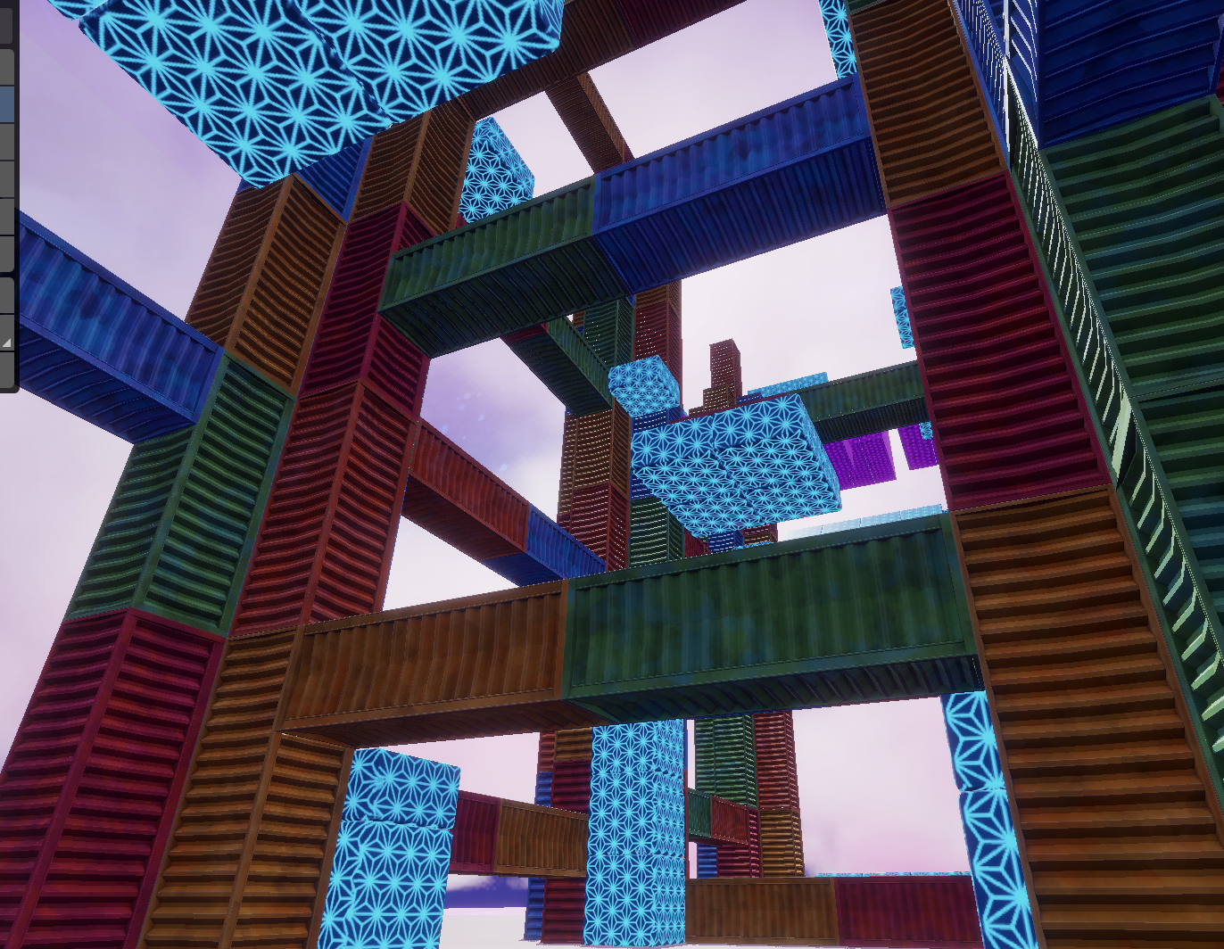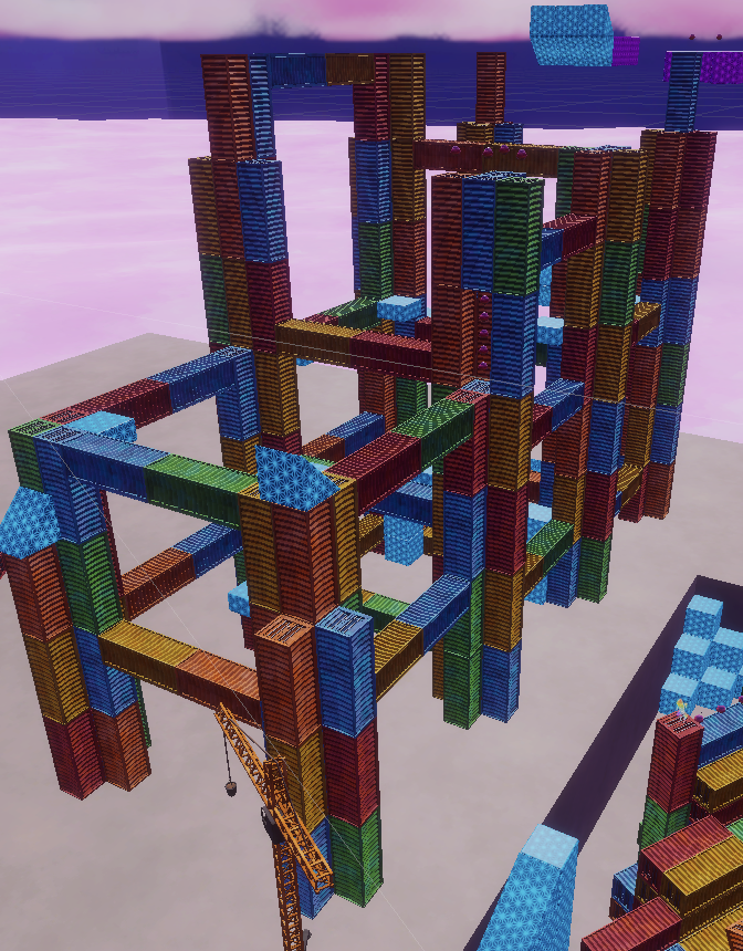 With that said, we still have our work cut out for us, especially when it comes to me making the levels. In this last sprint, however, some good progress was made. We decided that since we’re cutting down on the overall space of our level, and with the sunken city and lighthouse becoming more integrated with the port area, we should expand the port area and add more unique platforming spaces. This has proven to be both liberating and challenging, as I’ve decided to forgo much of the “realistic” placement of cargo containers. In the last sprint, I built a large structure made out of containers, with connecting pieces between these towers. This creates an interior space where players can platform seamlessly between the different connecting parts. Again, this ties back to the “playground” approach to level design. I’m essentially trying to make different play structures or spaces where players can platform in unique ways. This is liberating because I’m allowing myself to go a little crazy here, but it’s also incredibly difficult since I need to come up with unique spaces for players to use our movement system. And with how much freedom players have to move around the level, I also have to make sure each structure doesn’t overshadow the surrounding ones. For example, if I have a platforming challenge with a Memory Fragment on top of a tower, and another similar structure with a collectible on top, I need to ensure players can’t climb one tower and just jump over to the other, skipping an entire platforming segment. While I want to limit this as best I can, I also don’t want to compromise the scale and structure of the level because of it. At some point, I’ll have to be okay with players finding ways around my limits, and to some degree, I think this empowers them in a fun way. Sure, I don’t want to make things too easy, but if a player finds a creative way to use the movement system to bypass a platforming section, that’s something to celebrate. I just have to playtest and find the right balance between being too easy and allowing creative sequence breaking.